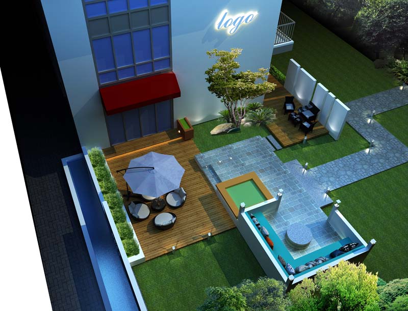 先從外觀布局講起:采用“露營”式野趣為設計主調,純白色外墻立面,搭配發(fā)光字體品牌LOGO,在黑夜中熠熠生輝;暗紅色雨棚設計,與青翠綠色草地在顏色上形成鮮明對比;花崗巖碎石地磚鋪就一條草間小路,連接起分布在外院不同角落的休息洽談區(qū)域,形成“散而不亂”的空間布局效果。