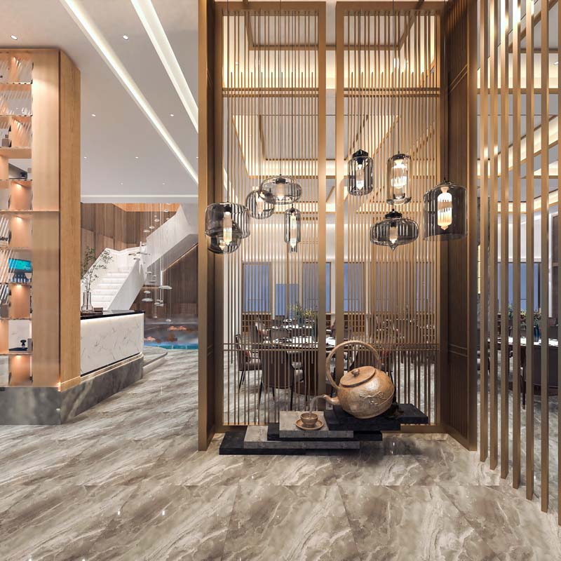 基于現(xiàn)代輕奢感“高檔宴會型餐廳”定位,為滿足消費(fèi)者的視覺、觸覺等諸多感官體驗(yàn),覃工選擇著重使用深淺不一的木色作為基礎(chǔ)色調(diào),搭配淺金色裝飾線條,分布在燈具、吊頂、屏風(fēng)線條等位置,突出打造“莊重、恢弘”的餐廳氛圍感。
