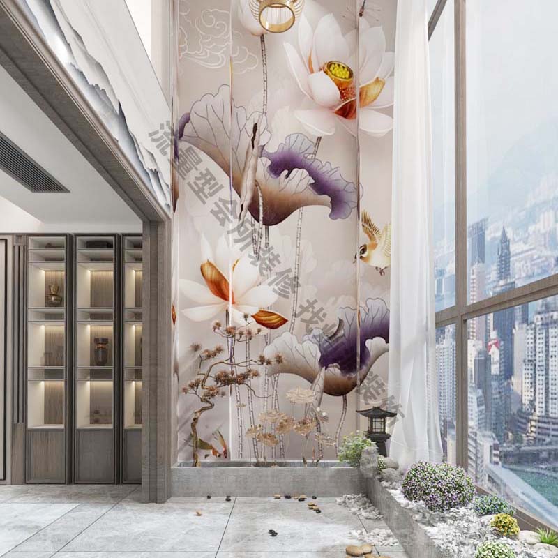 洽談區(qū)使用中式的推拉門隔斷隔開,主坐前方的中式柜不只具有美觀裝飾作用,更影響人們的視覺感知,結(jié)合陽(yáng)臺(tái)的大型荷花手繪,中式建筑與自然地融合,無(wú)一不透露著舒適與愜意。