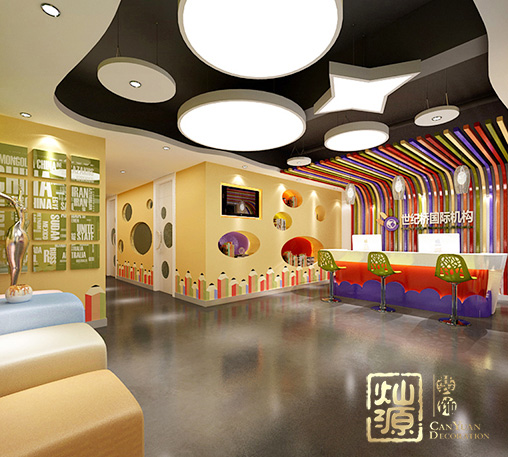 南寧培訓(xùn)學(xué)校裝修設(shè)計(jì)進(jìn)門大廳區(qū)域設(shè)計(jì):因?yàn)?/span>設(shè)計(jì)師考慮本培訓(xùn)機(jī)構(gòu)主要是為10歲以下兒童業(yè)余培訓(xùn)技能的場所,南寧培訓(xùn)學(xué)校室內(nèi)裝修所有色彩方面主要以鮮艷紅、綠、黃、紫為主色調(diào),大廳中央將立柱設(shè)計(jì)成智慧樹進(jìn)行裝飾,既寓意深刻又能供人們休息。天花運(yùn)用月亮、星星、太陽等元素吊頂,亮麗的時(shí)尚桌椅將整個(gè)空間帶入一種夢幻境界。