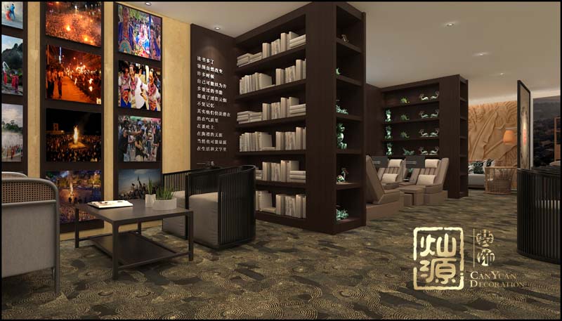 文化展示區(qū)和閱讀室展示了北京德人企業(yè)的文化,讓貴賓接待室設(shè)計裝修空間具有一定的“閱讀性”,而全部的展架采用深色的木質(zhì)展架不僅是在新中式空間風(fēng)格上的統(tǒng)一,更是傳達一種穩(wěn)重大氣的態(tài)度。