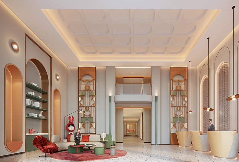 然后是提供辦理入住退房等手續(xù)、等候休息等功能的前臺大廳部分,單人單個前臺桌的設(shè)計,別致好看的同時還能提升辦理體驗感;若是有團(tuán)體顧客需要開辦會議怎么辦?別著急,可容納60-80人的小型會議廳明亮又素雅,期待您的光臨!